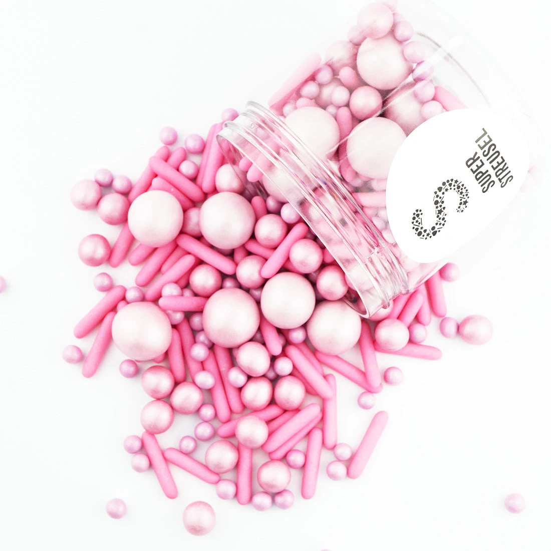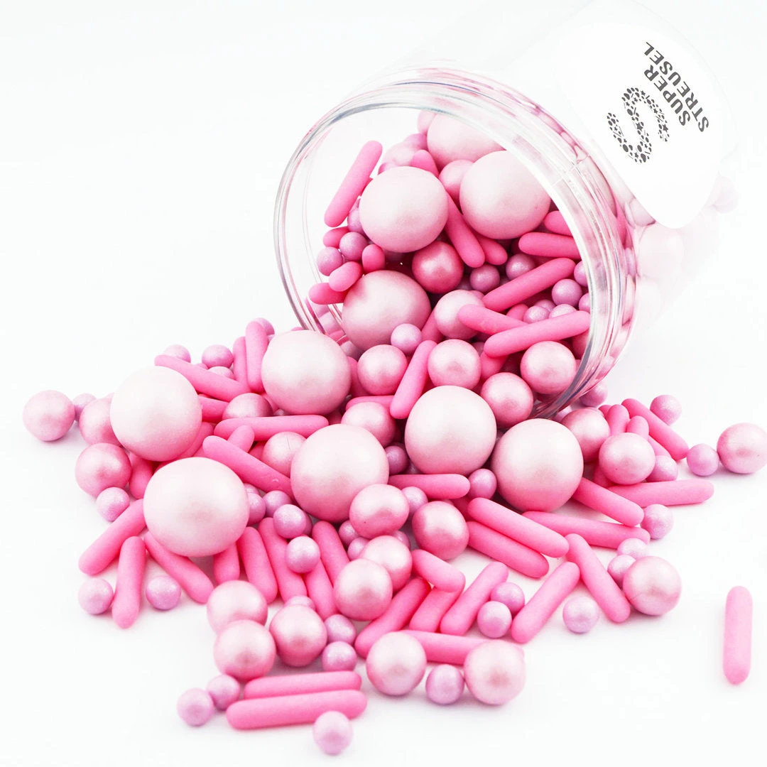 Nimm diesen Mix und tauche ein in deine rosa ZuckerwatteWelt: eine Mischung aus großen und kleinen soften rosa Schokokugeln, zarten XL-Knusperkugeln mit Knusperkern und mattrosa Zuckersticks (die mit der rohen Nudel in der Mitte!). Dieser Super Streusel Mix ist der Joker auf der nächsten MädchenBabyparty, GenderRevealParty oder zur Taufe. Verziere Torten, Cupcakes oder Desserts mit unterschiedlichen Formen, aber dafür immergleichen Farbe: ROSA!