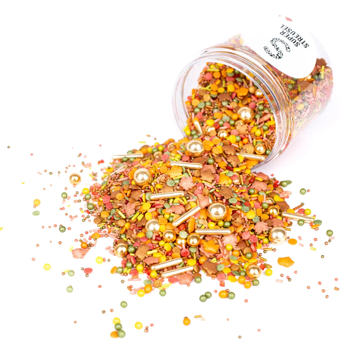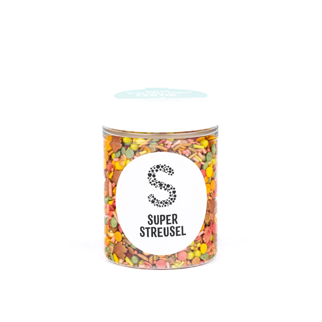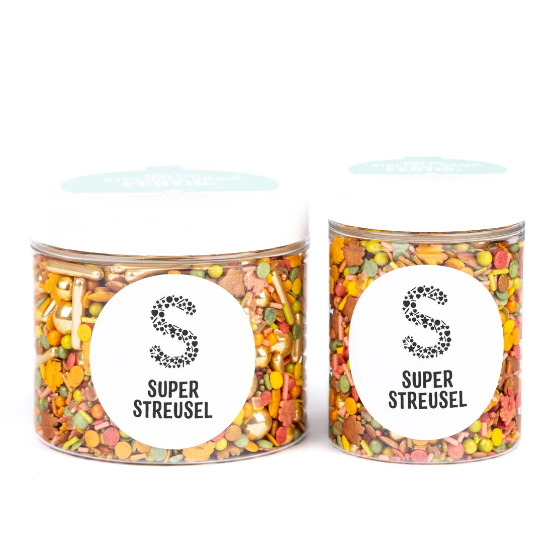 RaschelRaschel, RaschelRaschel – ein romantischer Herbstspaziergang durch den bunten Wald mit dicken Laubbäumen, die ihre Blätter in den leuchtendsten Rot–, Orange– und Gelbtönen langsam fallen lassen. Klare, frische Herbstluft und die letzten warmen Sonnenstrahlen, die den Wald in goldenes Licht tauchen. Hachhh, schöner hätten wir unseren StreuselMix “BlätterWetter” nicht beschreiben können. Der goldene Herbst im StreuselDöschen: dunkelgelbe, goldene und bronzefarbene Herbstblätter zusammen mit gelben, olivfarbenen, roten und orangenen KonfettiStreuseln, Zuckerkristallen und KügelchenStreuseln. Dazwischen goldene Schokokugeln und goldene Zuckersticks. Wir könnten also auch sagen: Mehr Herbst geht nicht! Also ab mit BlätterWetter auf PumpkinPie, Apfelkuchen und Zwetschgentorte.