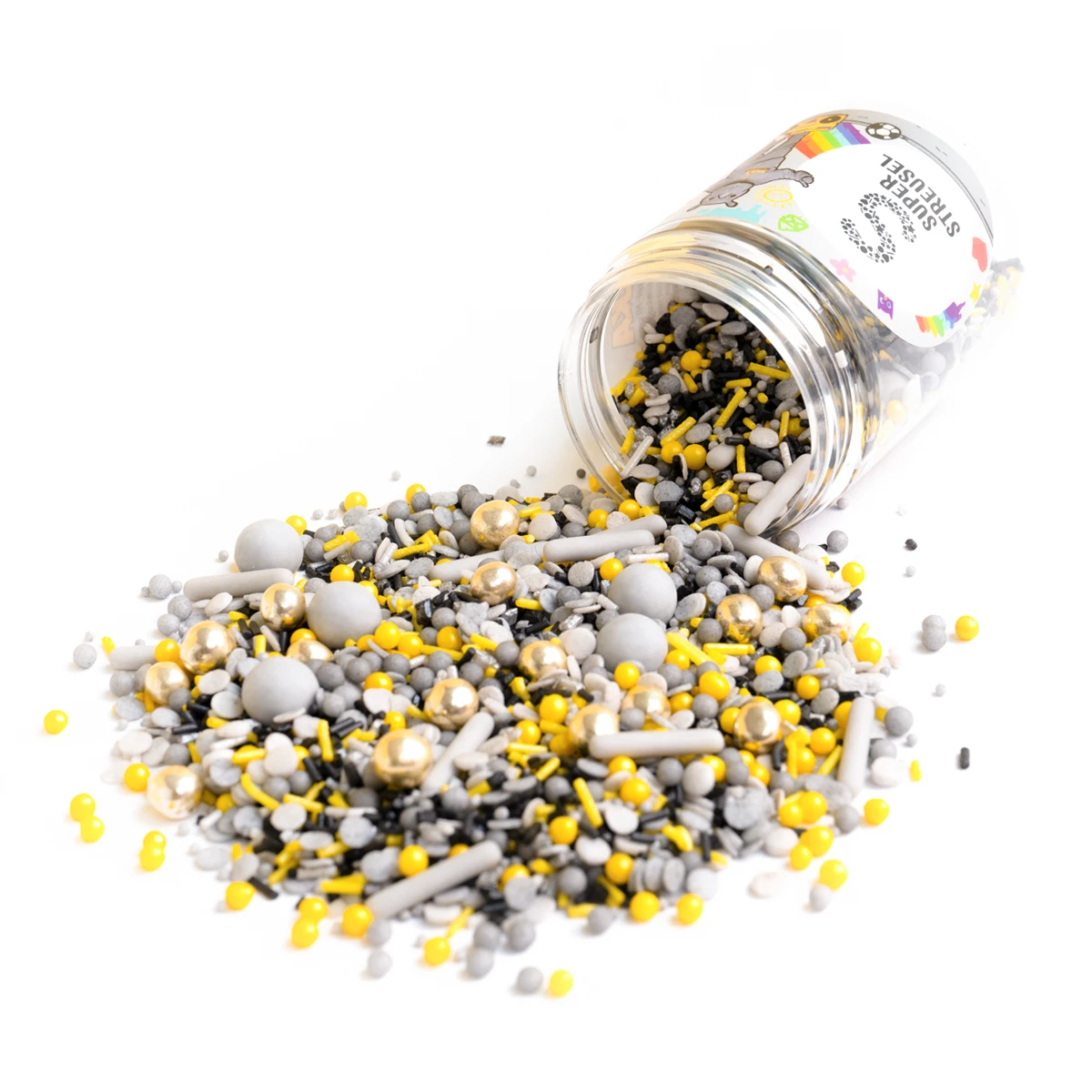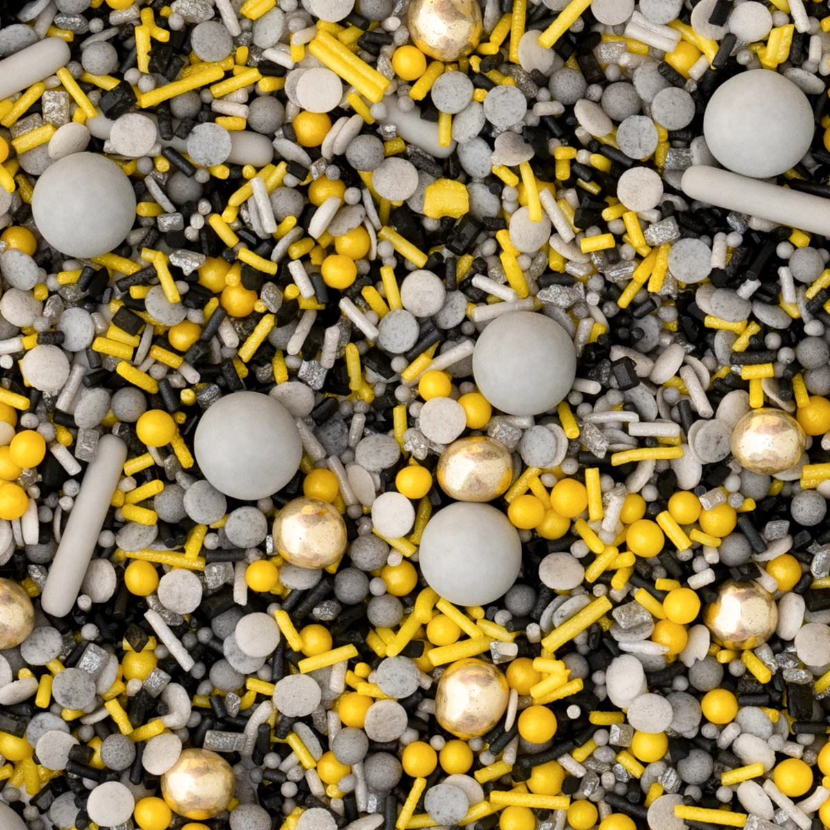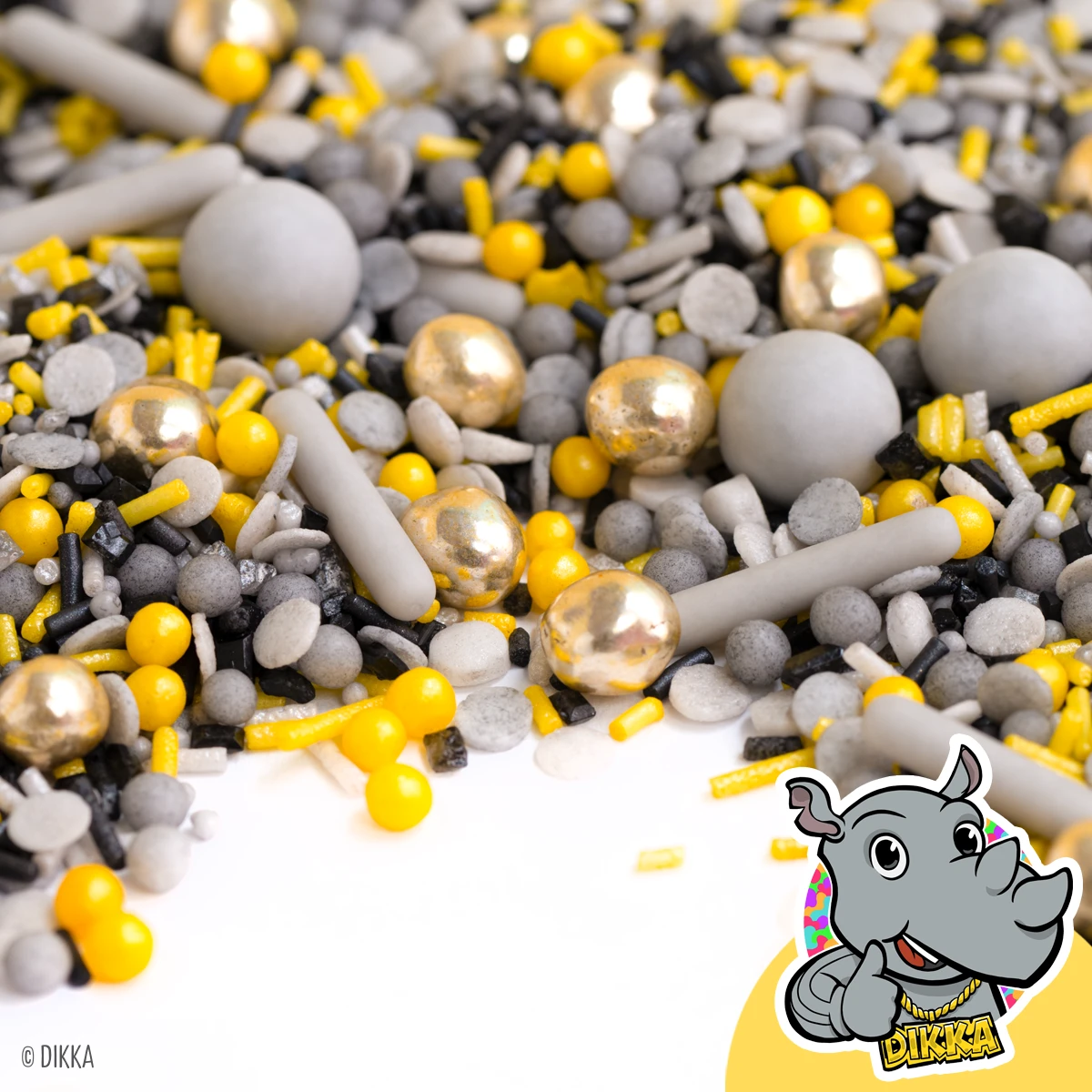 Das ist drin im DIKKA StreuselMix: ganz viele graue und gelbe Konfetti- und Kügelchenstreusel, graue Zuckersticks und Schokokugeln und dazu glänzende Highlights mit kleinen goldenen Knusperkugeln. Und das Beste: Die sehen nicht nur toll aus, die schmecken auch noch megamäßig! Unsere Schokokugeln sind super soft mit leckerer Schoki und die Knusperkugeln mit oberleckerem Kekscrunch gefüllt.