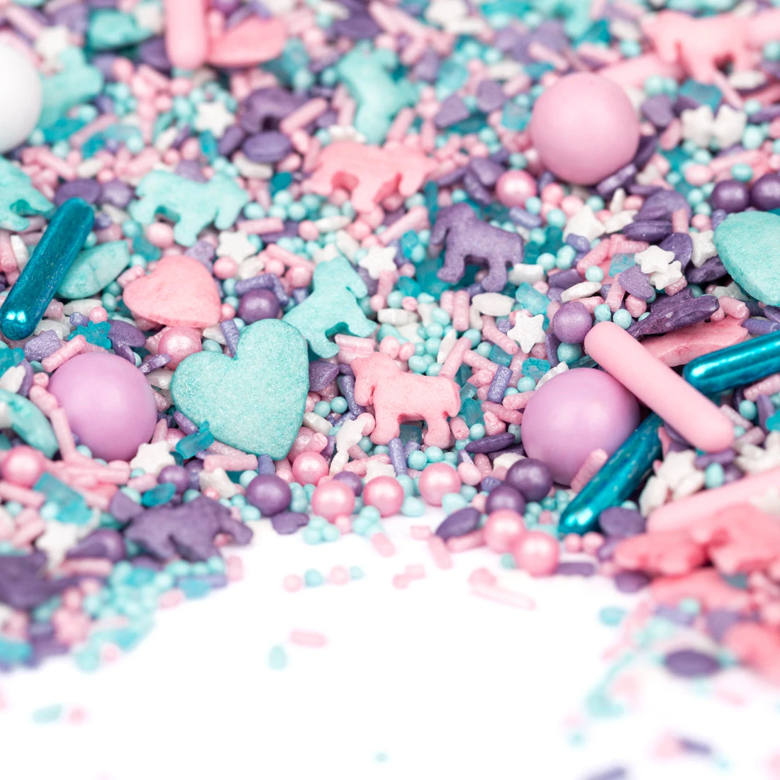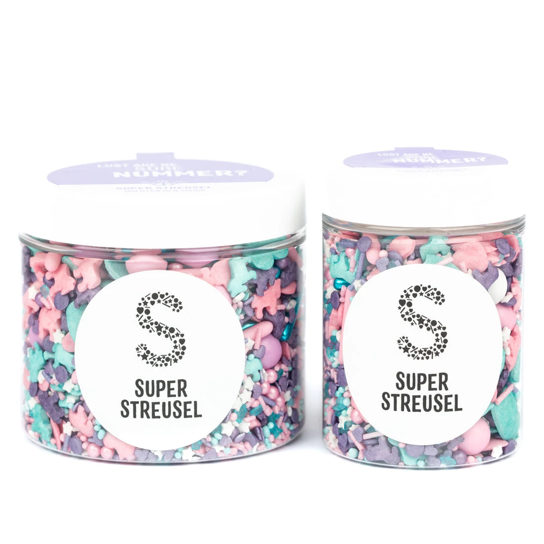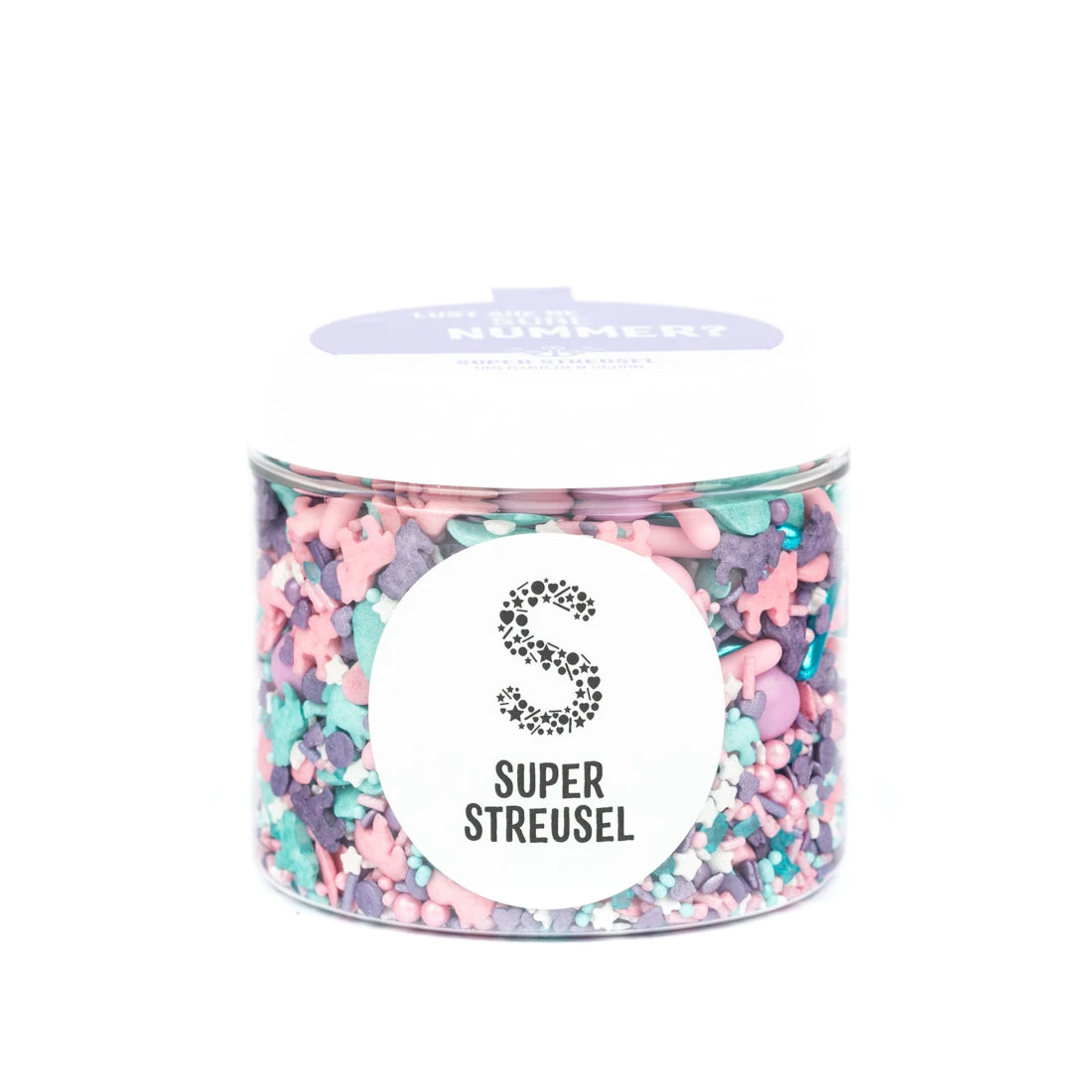 Ja richtig gesehen, es sind Einhörner!! Einhorn-Streusel in diesem pastelligen Traum an Streuselmix. Wir haben all die Einhornmagie, die wir finden konnten in diese Einhorn Kuchendeko gepackt, dabei an Feen, Zauberer und liebe Elfen gedacht…puffpuff… da war er geboren! Der Streuselmix, der dich und alle kleinen Mädchen in deiner Nähe zum kreischen bringt: „uuuuh, ist der süß“ , „oooooh, der Mix ist ja wirklich Zucker!“. Es kann auch zu spontanen Liebesbekundungen deiner Kinder kommen (so: „Maaaammmmaaaaa, dubistdieBesteichliebedichdankedankedankefürdentollstenSuperStreuselMixderWeltichwerdjetztimmermeinZimmeraufräumen!!!“). Neben den Einhorn-Streuseln in rosa, türkis und lila haben wir noch mehr MiniStreuselHerzen, RiesenHerzen, Konfettistreusel und glitzernde Zuckerstreusel dazu gemischt. Dazu eine ordentliche Portion fliederfarbene Schokokugeln und – der Kinderkracher schlechthin! – blaue und rosane Zuckersticks. Warum Kinder die so lieben? Innendrin ist eine dünne rohe Nudel, die mit Zucker ummantelt ist – der coolste Knabberspaß schlechthin! Also wie schon gesagt, wir haben ENDLOSE Einhornmagie in unseren EinhornParty-Mix gepackt. Also los, beeinhornsuperstreusel dein Leben!