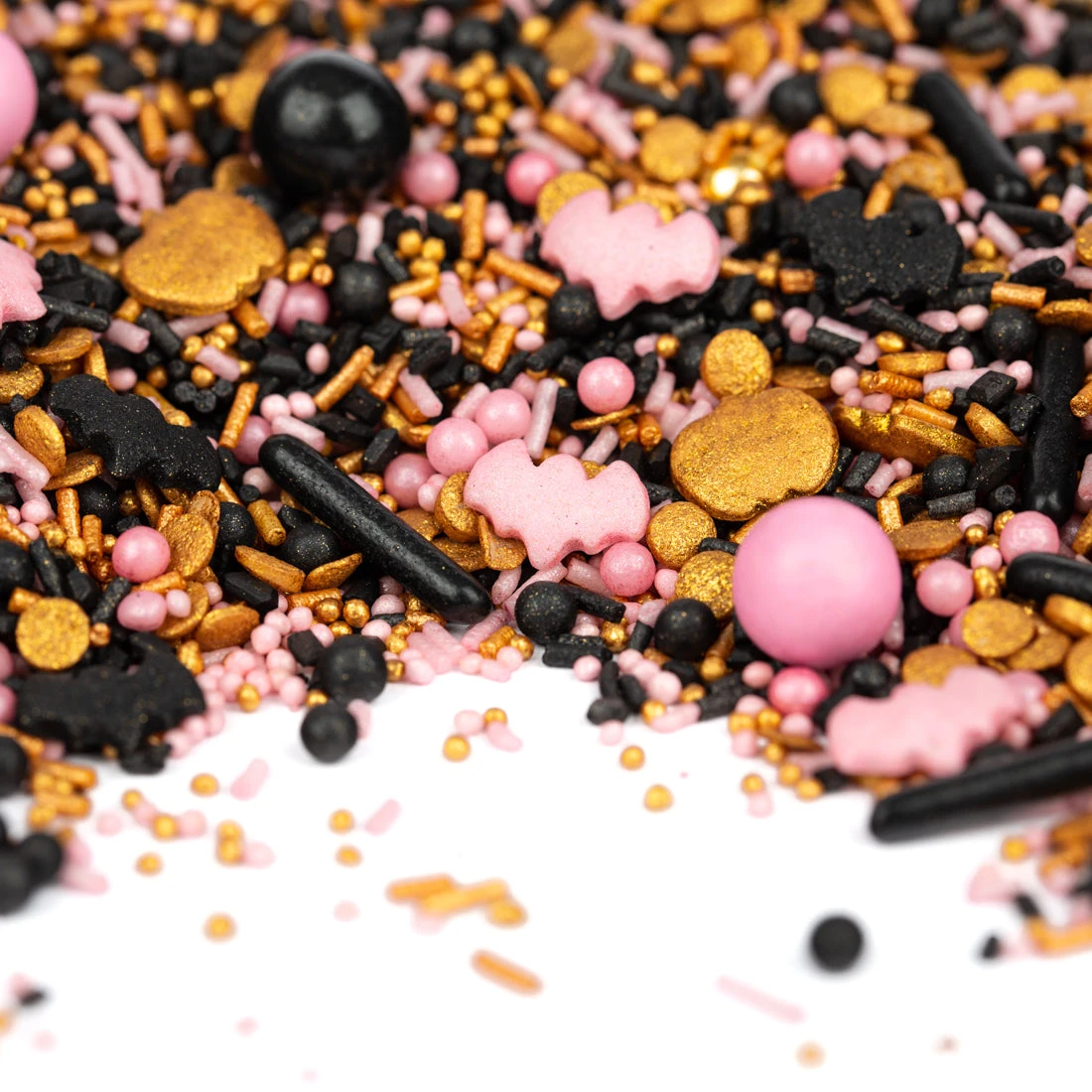 Grrrrr, Arrrrr, wenn die ausgehölten Kürbisse mit ihren finsteren Fratzen im Haus verteilt sind, wenn sich die Hexen und Gespenster in Schale schmeißen und die Dunkelheit einbricht, ist endlich Zeit für deine schaurig schöne und ungeheuerlich leckere HalloweenParty. Da kommt FlederFlatti mit seinen rosa und schwarzen FledermausStreuseln in Windeseile angeflattert und begruselt GruselCupcakes, MonsterCakepops und FriedhofKuchen. Auch in FlederFlatti mit dabei: Goldene KürbisStreusel, zarte Schokokugeln in Rosa, Schwarz und Gold, schwarze Zuckersticks und ganz viele schwarze, goldene und rosa KonfettiStreusel, KügelchenStreusel und Nonpareilles.
