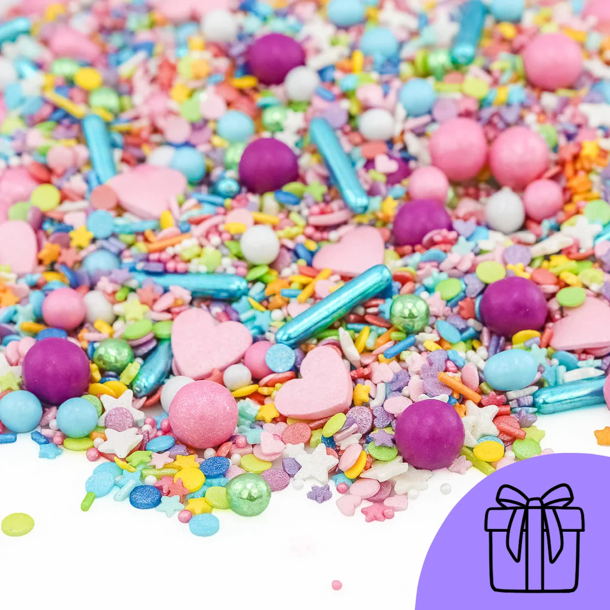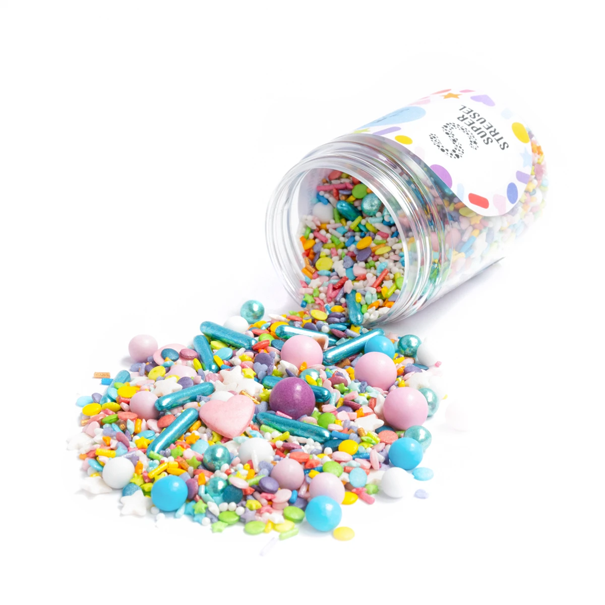 Drin ist alles, was Streuselhausen zu bieten hat: große rosa Herzchen, kleine bunte Herzchen und Sternchen, Schokokugeln in Lila und Rosa, glänzende Zuckersticks, mini Knusperkugeln und jede Menge kunterbunte Konfetti- und Kügelchenstreusel.