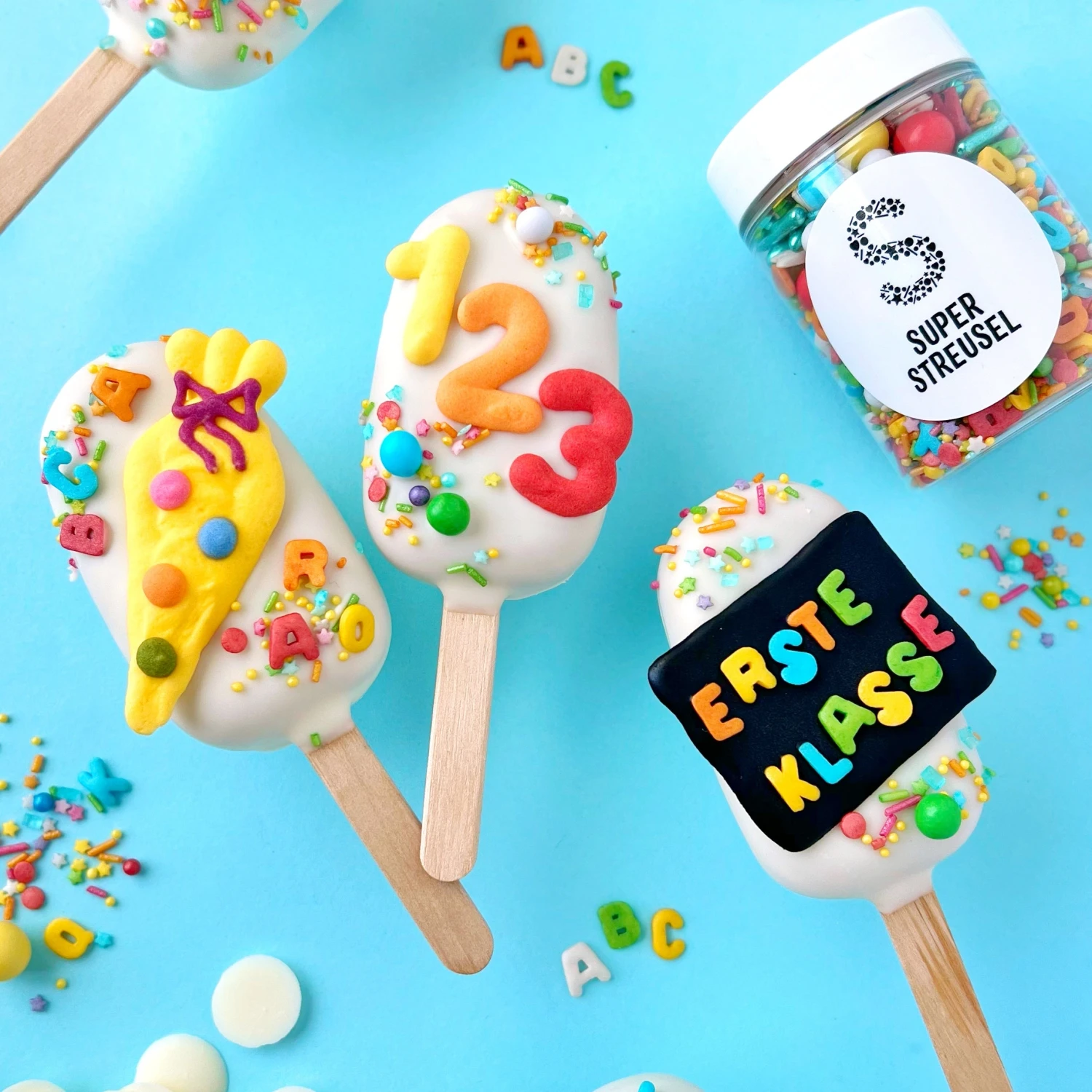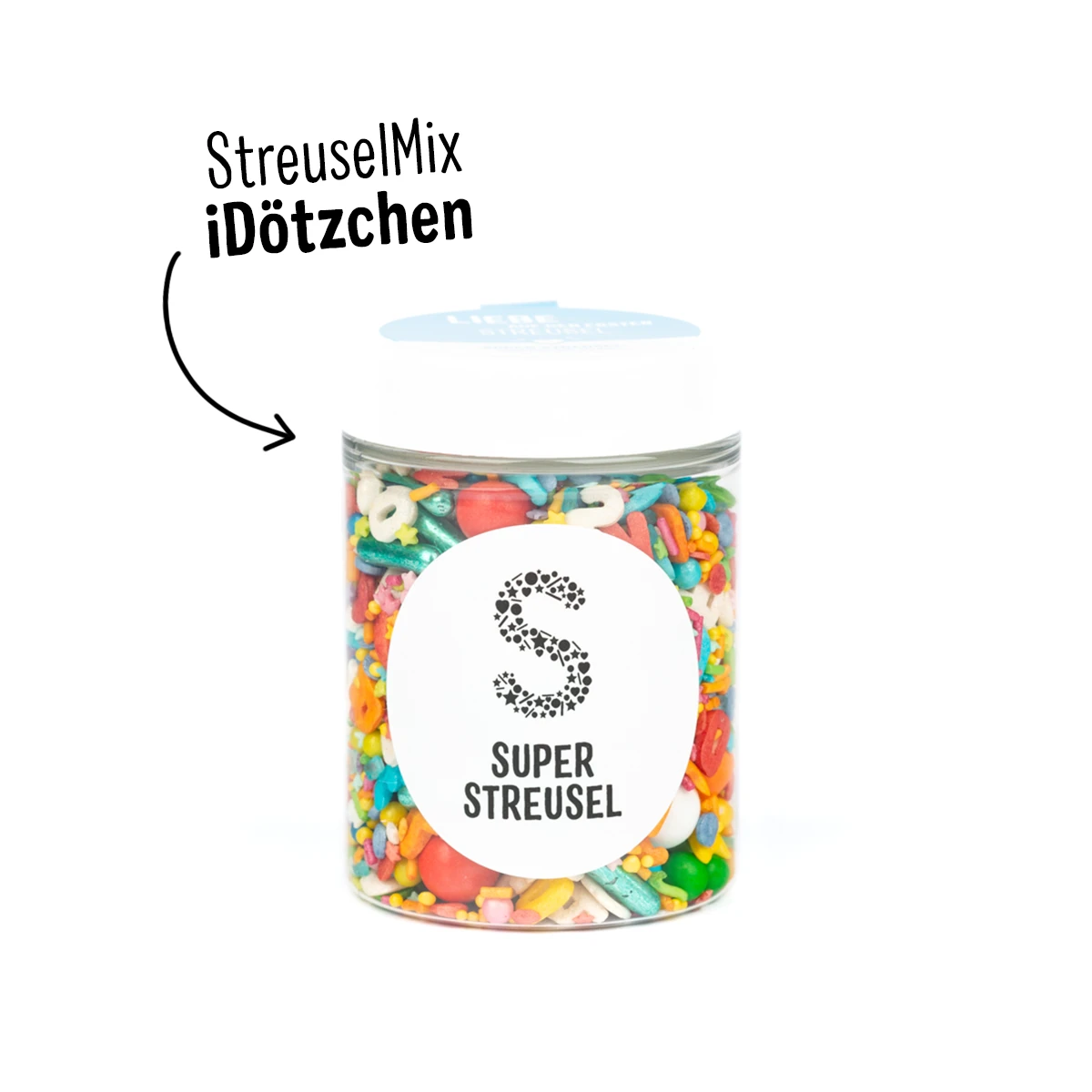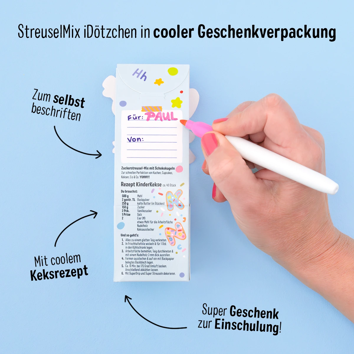 Bald ist Einschulung – juhuuuu! Was in der tollsten Schultüte auf keinen Fall fehlen darf, ist StreuselMix iDötzchen. Damit sorgst du neben Stiften und Süßigkeiten für eine ganz besondere Überraschung. Mit iDötzchen Streuseln kannst du zusammen mit deinem Einschulungskind in der Küche durchstarten und gemeinsam leckere Kuchen & Kekse backen und verzieren. Im StreuselMix sind leckere Schokokugeln, glänzende Zuckersticks und jede Menge kunterbunte Buchstabenstreusel.