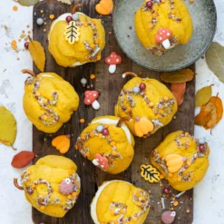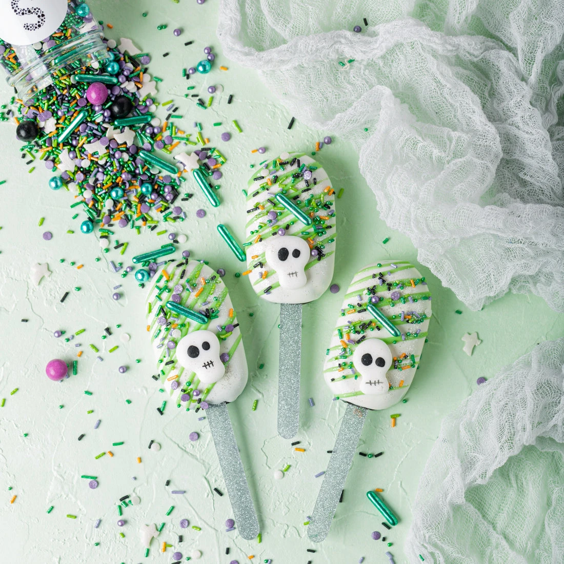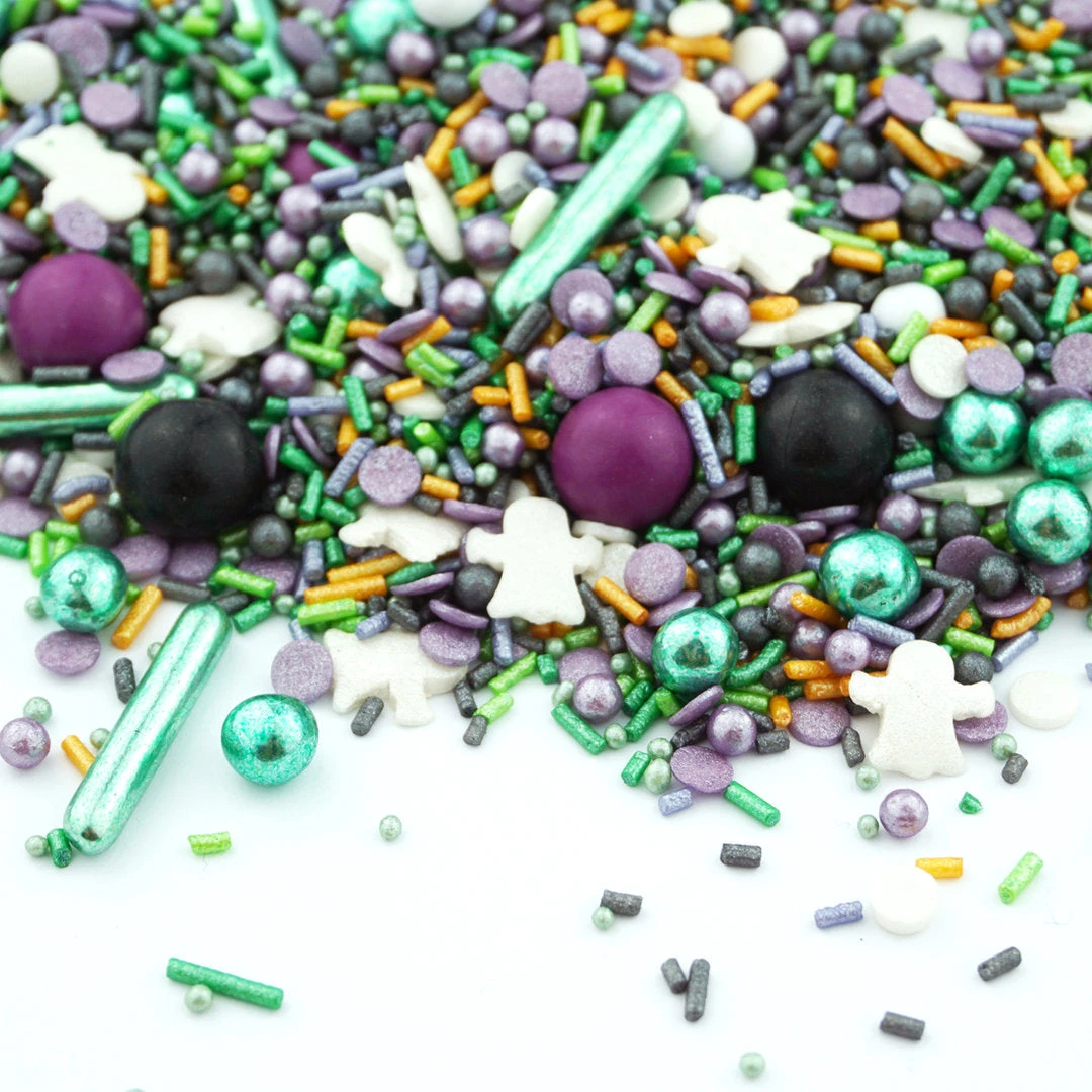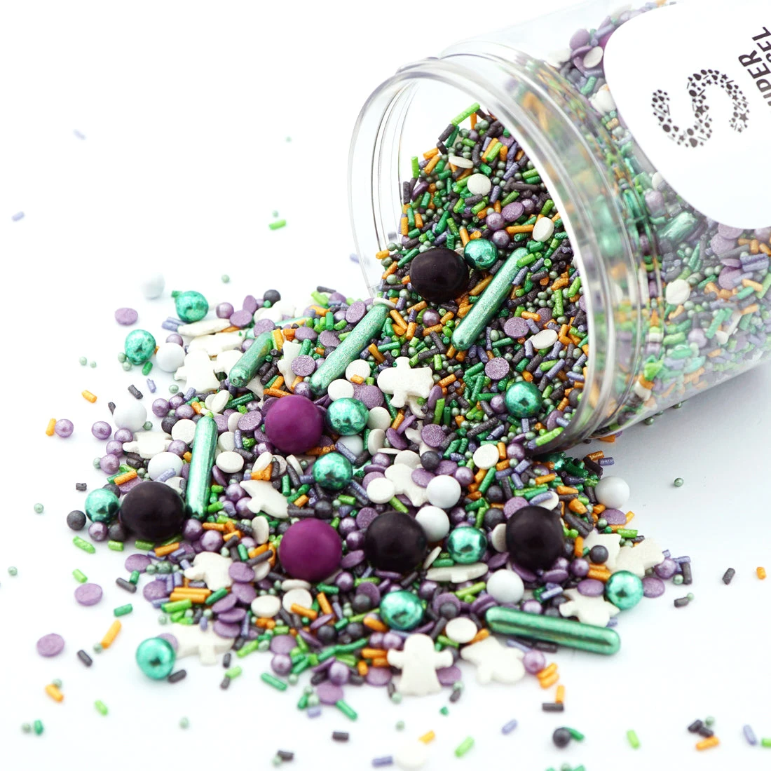 Mit diesem wundervollen StreuselMix hast du alles, was du für eine schaurigschöne Kuchenparty brauchst: weiße Geisterstreusel, lila, grüne und gruselschwarze Zuckerstreusel, lila Konfetti und Perlchen, gemixt mit unseren Super Streusel Stars: grün-metallic glänzende Knusperkügelchen und große lila und schwarze Schokokugeln mit zartem Schokokern. Dazu noch ein Schwung grüne Zuckersticks – da vergisst man vor lauter Streuselfreude ja fast sich zu gruseln! Buh.