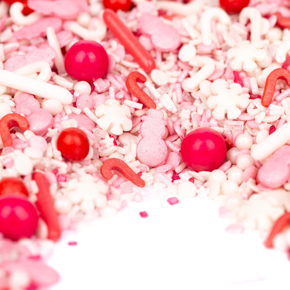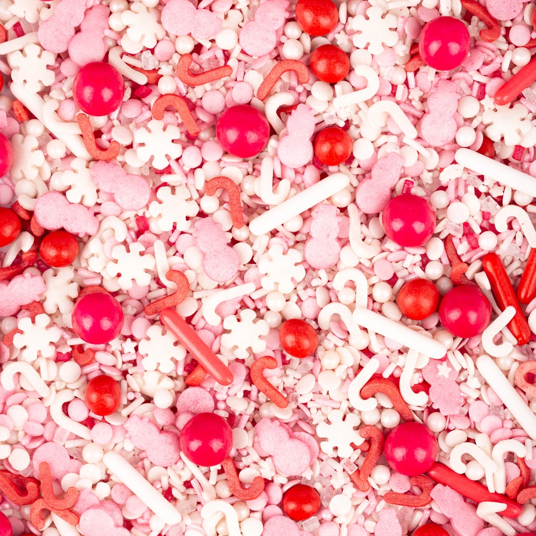 Highlights sind die süßen Zuckerstangen, Schneeflöckchen und Schneemänner in Rosa, Rot und Weiß, dazu pinke Schokokugeln, rote und weiße Zuckersticks und kleine weiße KügelchenStreusel. Zusammen fühlen sie sich besonders wohl auf Ausstechplätzchen, Lebkuchen und winterlichen Desserts.