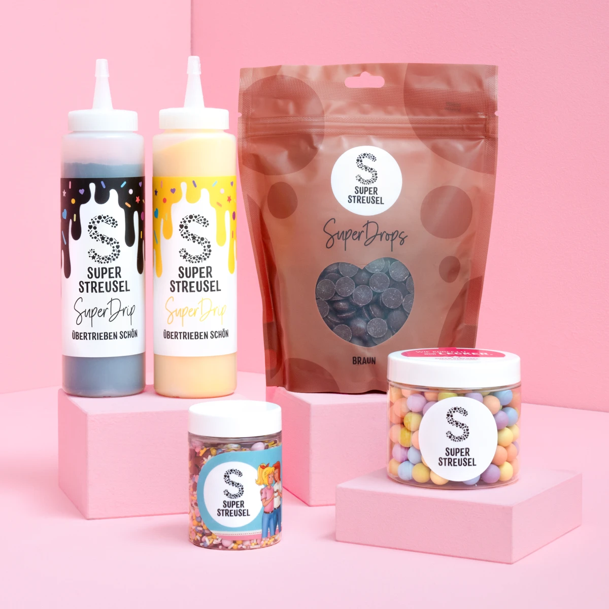 Erfülle den superstreuseligen Traum aller großen und kleinen PferdeFans mit einem Kuchen im PferdeStyle. Schau dir mal das Video an – ist suuuuper einfach nachzumachen und haut garantiert alle aus dem Sattel. Alles, was zu dafür brauchst, bekommst du mit diesem PferdeSet direkt nach Hause: SuperDrops Braun, um deinen Kuchen komplett damit einzustreichen, SuperDrip Schwarz zum Malen des Gesichts, SuperDrip Gelb für die Mähne, bunte Schokokugeln für das Halfter und natürlich StreuselMix Bibi&Tina mit kleinen PferdchenStreuseln für den superstreuseligen Wow-Effekt.