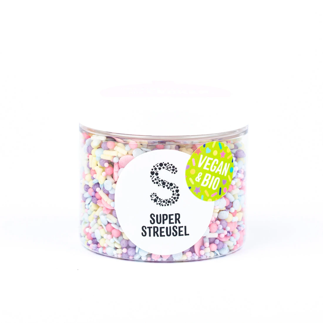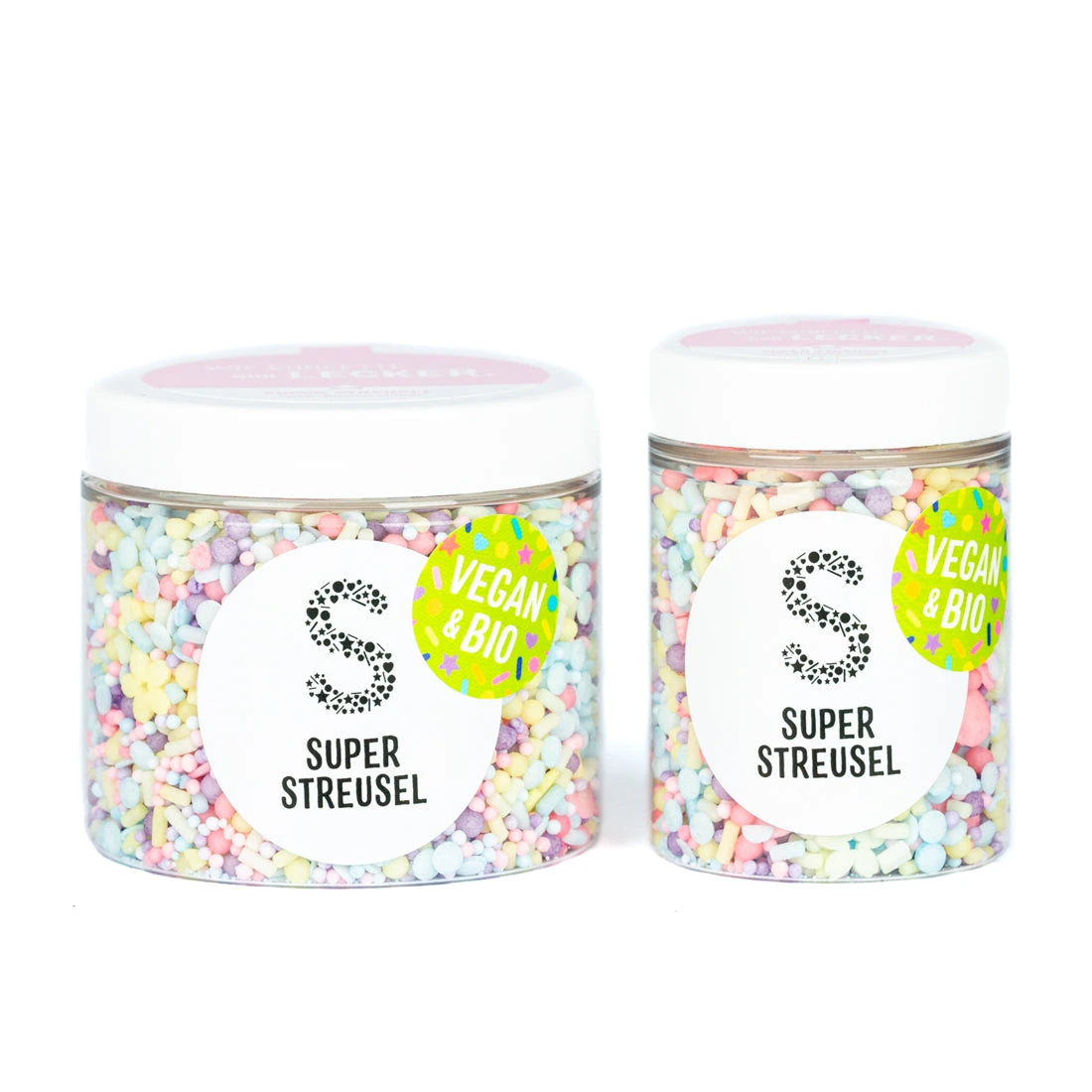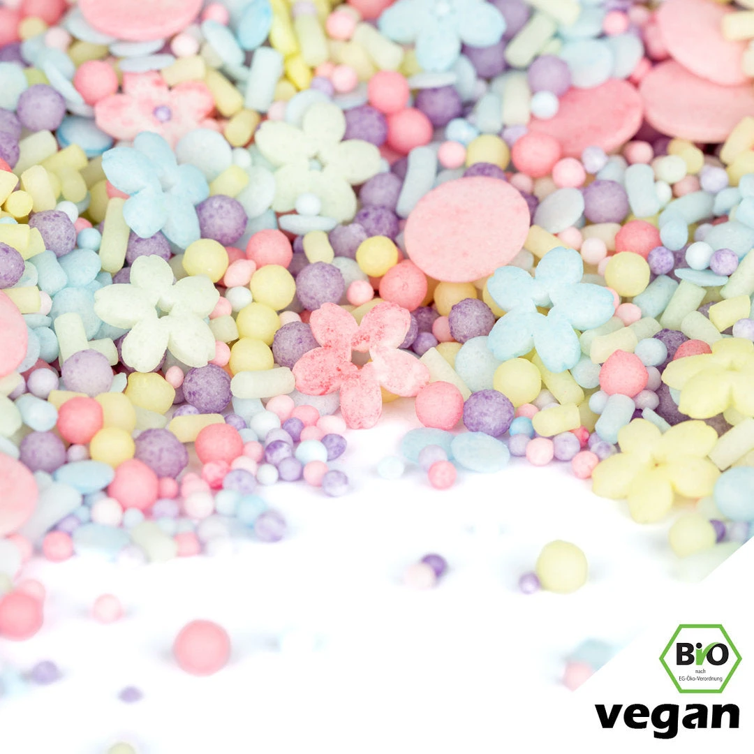 Die volle Dröhnung pastellige FlowerPower! PusteBlümchen ist vielleicht der liebste, putzigste und zarteste StreuselMix aller Zeiten. Der ist so zart wie die kleinen Schirmchen der Pusteblumen, die über die Blumenwiese tanzen, wenn du einmal kräftig Puuuuuuust machst. Sie fliegen umher und legen einen zauberhaften Schleier über die frische Blumenwiese. Und PusteBlümchen macht genau das mit deinem Gebäck: Die kleinen, bunten Blümchen, Nonpareilles und KonfettiStreusel legen sich auf deine Waffeln, Desserts oder Kuchen und in Windeseile ist ein pastelligzauberschönes BackKunstwerk gestreuselt.