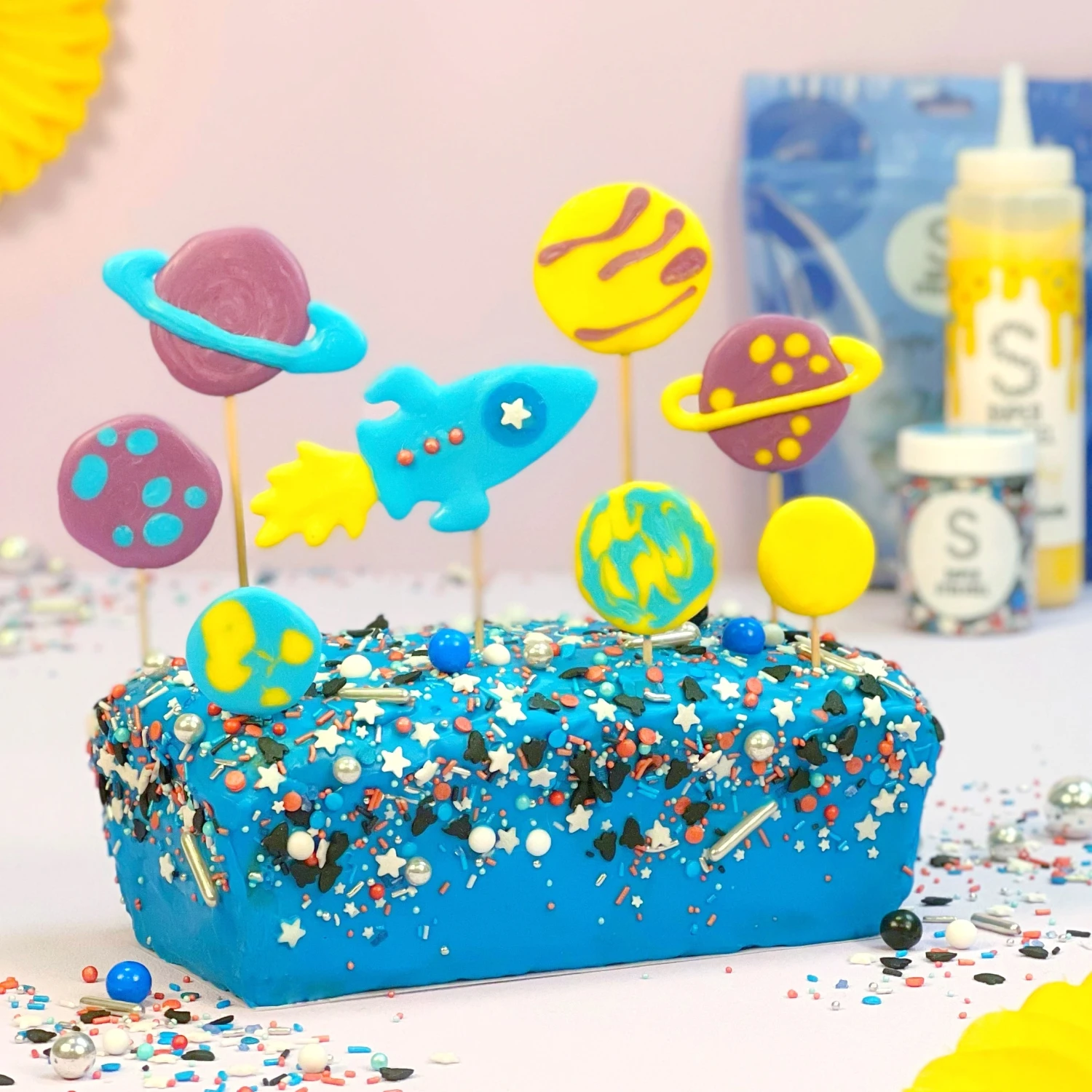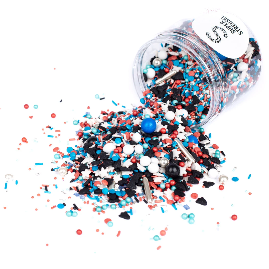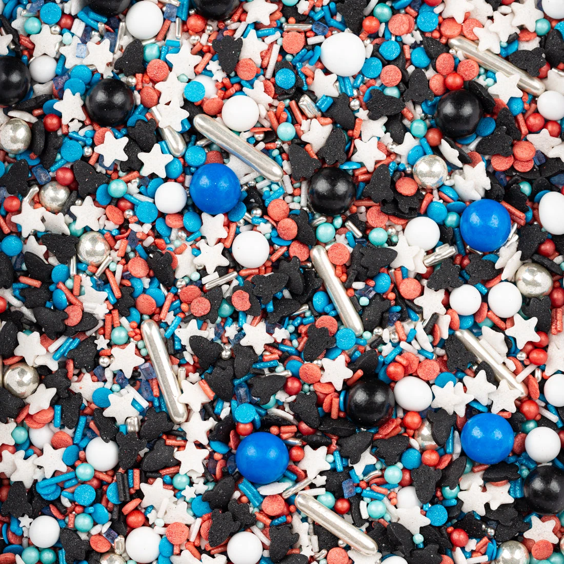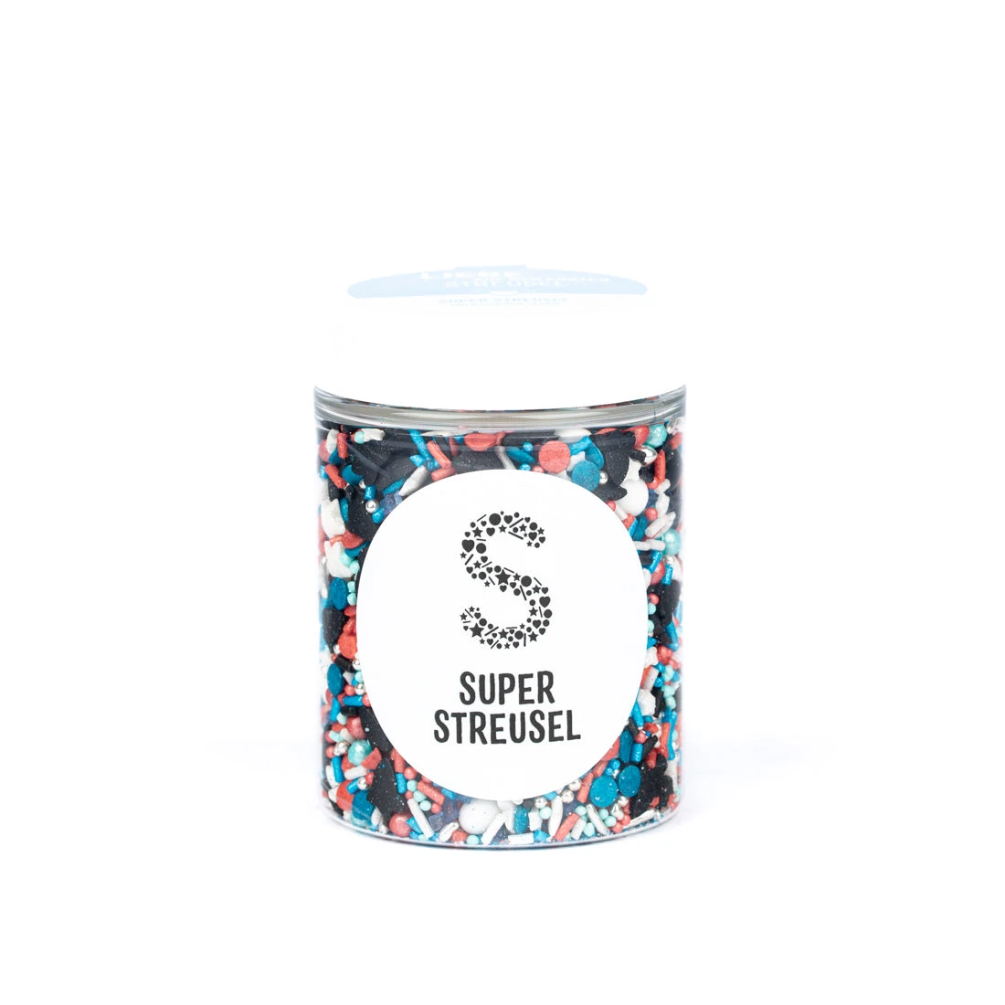 Dieser Zuckerstreusel-Mix goes out to all the Raketentüftler, Legobauer, Astronautenanwärter, Weltraumfans und Partygranaten in der Galaxis. Deswegen haben wir extra viele rockige Streusel reingemischt: blaues Konfetti, blaue Zuckerstreusel, große zarte Schokokugeln in blau und raubeinigem schwarz, rote Konfettistreusel, silberne Perlchen und silberne Zuckersticks. Als harmonische Abrundung noch ein paar große weiße Zuckersterne aus dem Weltall und zarte weiße Schokokugeln. Und gaaanz neu dabei: Raketenstreusel!! Also ganz ehrlich, wer schnallt sich da nicht sofort den Astronautenanzug und stellt sich an den Backofen um die nächsten raketenmäßigen Partykuchen zu backen? 3-2-1, Lift off!