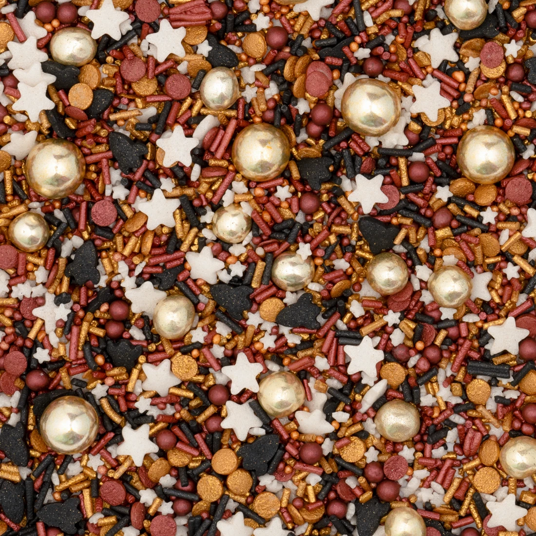 Edles bordeauxrot trifft hier auf goldiges Gold und schickes Schwarz, dazu habt ihr euch weiße Sternstreusel, Raketenstreusel und goldene Schokokugeln gewünscht – was für großartige Wünsche, denn das Ergebnis ist rossketig wow! Damit veredelt ihr zu hundert Prozent jeden süßen SilvesterSnack in ein raketenmäßig geniales HinguckerTeil. Ne richtige RossKete eben!