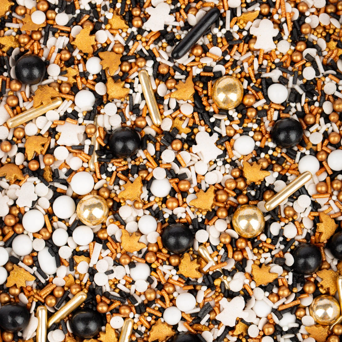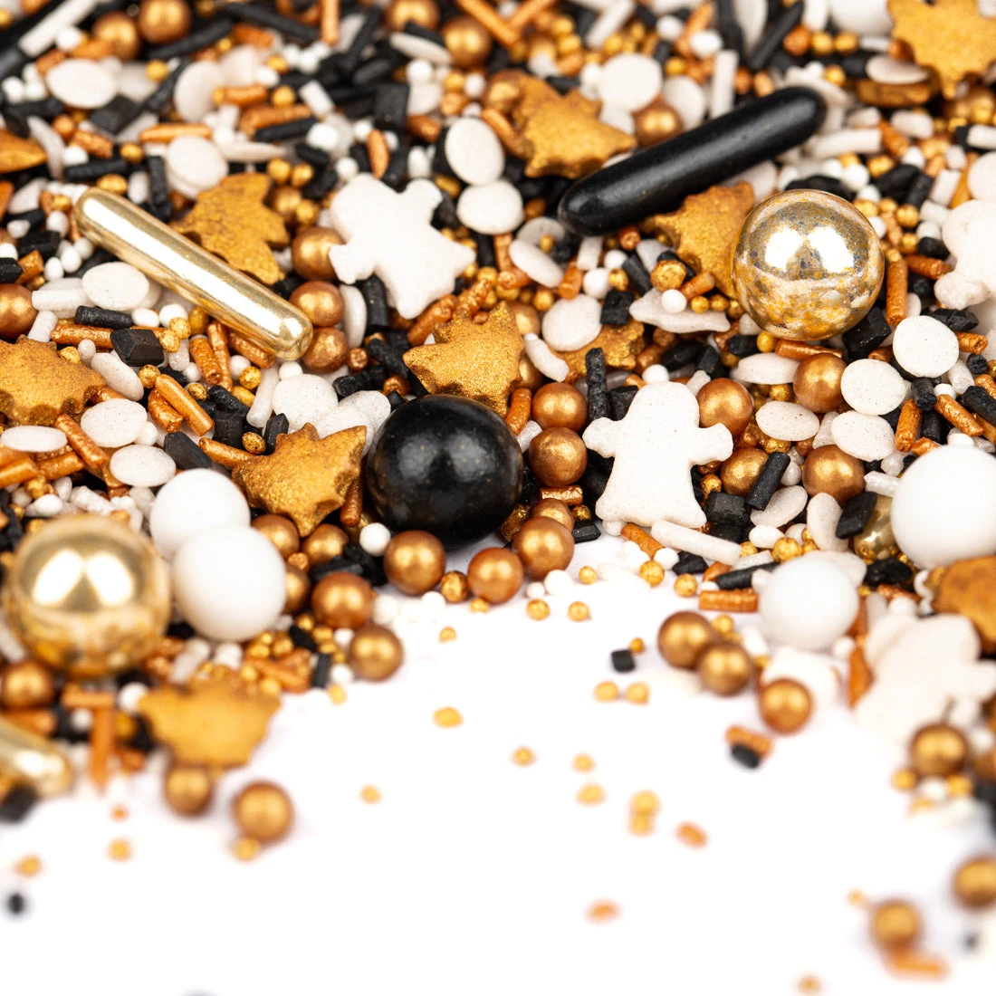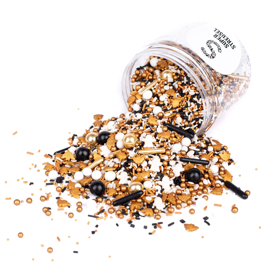 Die Turmuhr schlägt Mitternacht und BuuHuu – BuuHuu, die Geisterzeit beginnt! Da erwachen die Gespenster aus SchlotterSchreck und entfalten ihren wahren Schrecken. Sie fliegen weit entfernt in all die mystischen Burgen und Schlösser. Dort versetzen sie die Bewohner in furchtbare Angst, sie fliegen durch die kalten Gänge, schlüpfen in jedes Zimmer. Sie stibitzen alles, was golden funkelt und nehmen es mit in ihren StreuselMix. So haben sie die goldenen Schokokugeln, Zuckersticks, KügelchenStreusel und FledermausStreusel bei sich. Auch dabei: Schwarze und weiße Schokokugeln und weiße KonfettiStreusel.