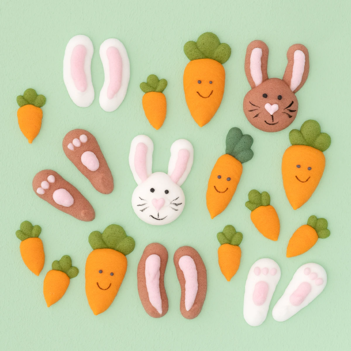 Jedes SuperDing ist selbst designt, von Hand gespritzt und bemalt worden (jaaa, alles von Hand gemacht! Nix Maschine!). Grinsende Häschen, süße HäschenPfoten und HäschenLauscher zaubern hübscheste OsterTorten und bei all den Häschen darf ein bisschen HäschenFutter auch nicht fehlen. Deshalb gesellen sich auch noch GrinseMöhren und MiniMöhren dazu. Das perfekte Set für Ostern!