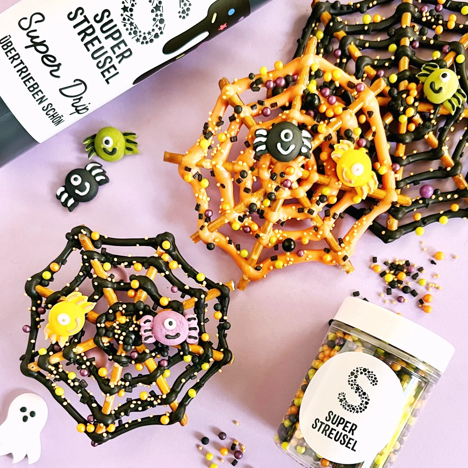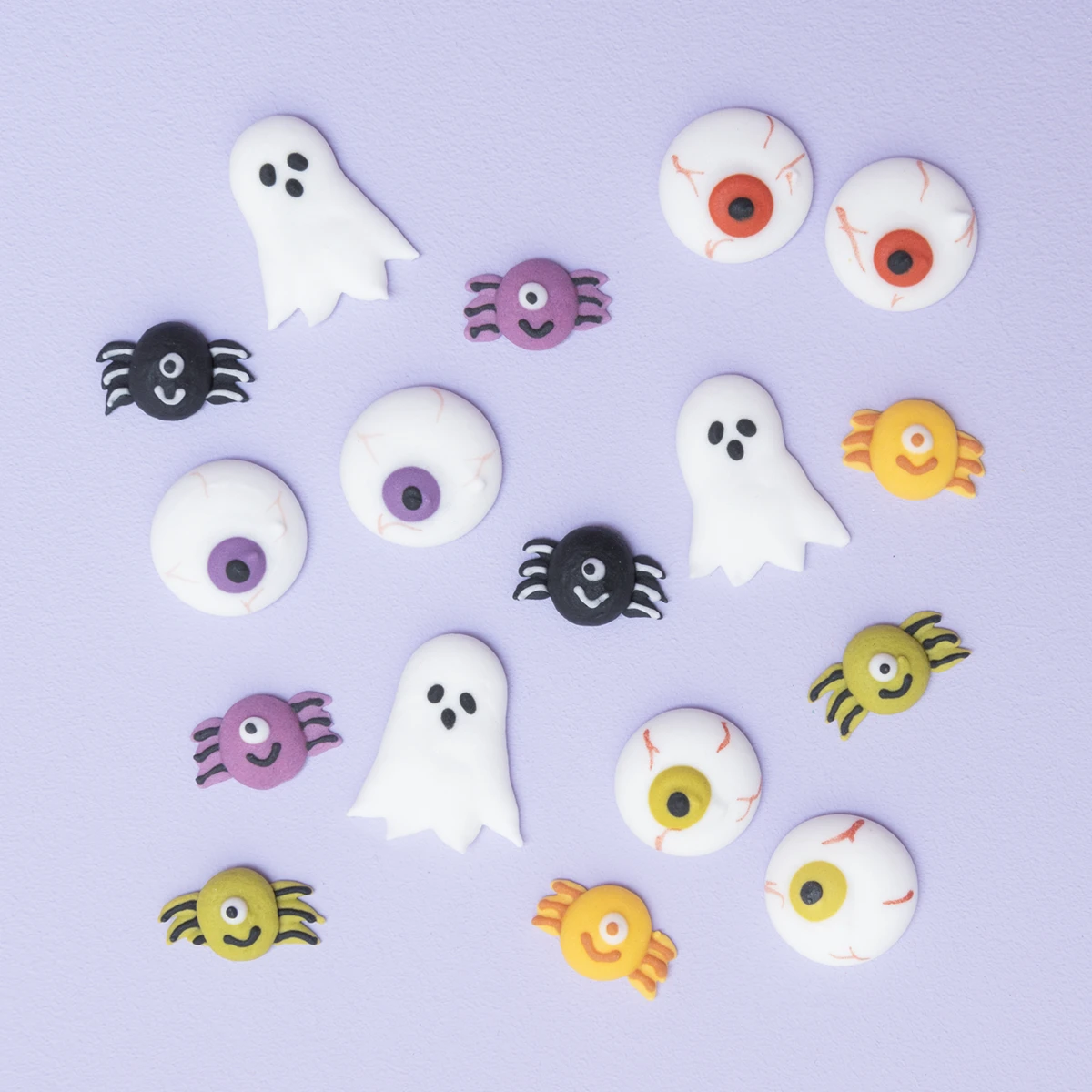 Jedes SuperDing ist selbst designt, von Hand gespritzt und bemalt worden (jaaa, alles von Hand gemacht! Nix Maschine!). Mit diesem ungeheuerlichen Halloween-Set wirst du dein Gebäck zum Gruseln bringen. Monsteraugen, Spinnen und Gespenster treiben hier ihr süßes Unwesen.