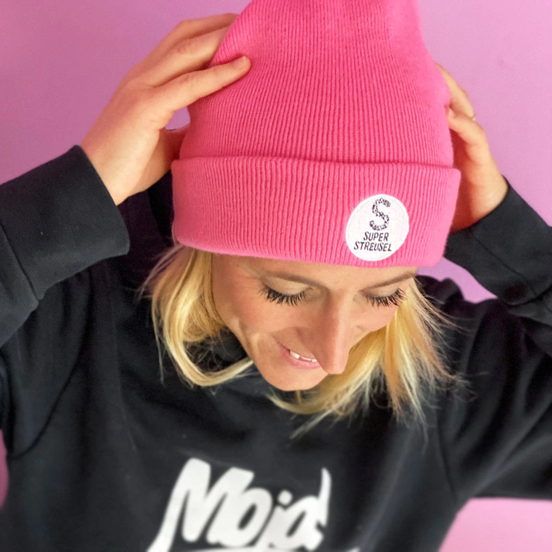 Dani ist der größte Mützenträger überhaupt mit einer Sammlung aus 24,5 unterschiedlichen Mützen für die kühlen Tage. Ihr Super Streusel MützenUrteil: Super!!!!! Das perfekte Model für jeden der eine Mütze braucht, der keine Mütze braucht, der gern rosa trägt, der superstreuslig ist und isst.