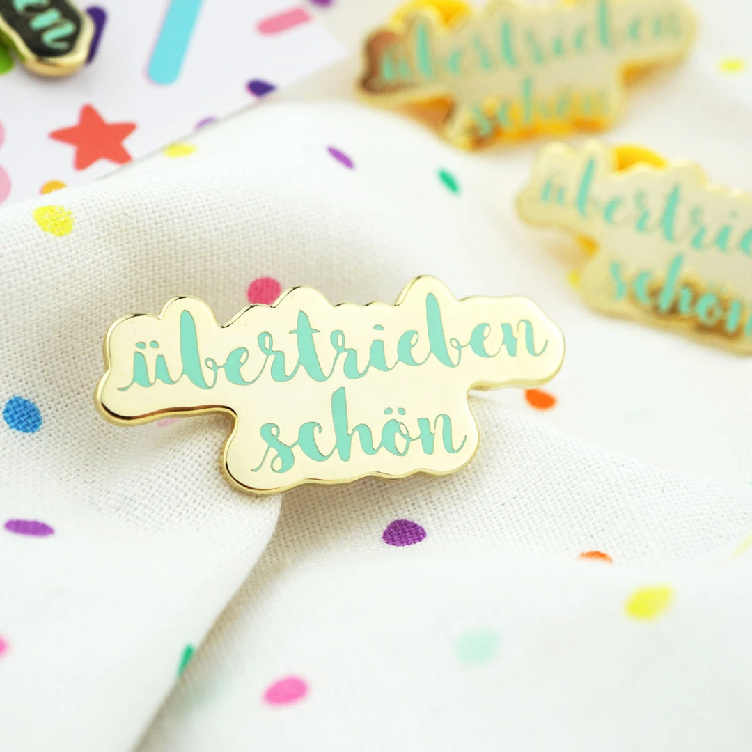 Wer ich eigentlich bin? Ich bin ein Emaille-Pin. Also ein Pin. Ich liebe es an Taschen, Rucksäcke, Jacken, Schals und Shirts gesteckt zu werden. Ich glänze gold, auf mir steht „übertrieben schön“ in zartem türkis, ich bin 3,5 Zentimeter breit und 1,5 Zentimeter hoch und ich garantiere dir: wenn du mich pinnst, hast du immer was zu erzählen. Oder die Leute werden dich ansprechen und so Sachen sagen wie „finde ich auch“. Und du erstmal so „hä?“ dann so „naja, was auf dem Pin steht. Dass du übertrieben schön bist, finde ich auch“. Oh Gott und dann du so, rot angelaufen „hihi, danke. Aber da gehts eigentlich um Streusel….ach egal, wollen wir n Kaffee trinken?“ … Hochzeit, Kinder….
