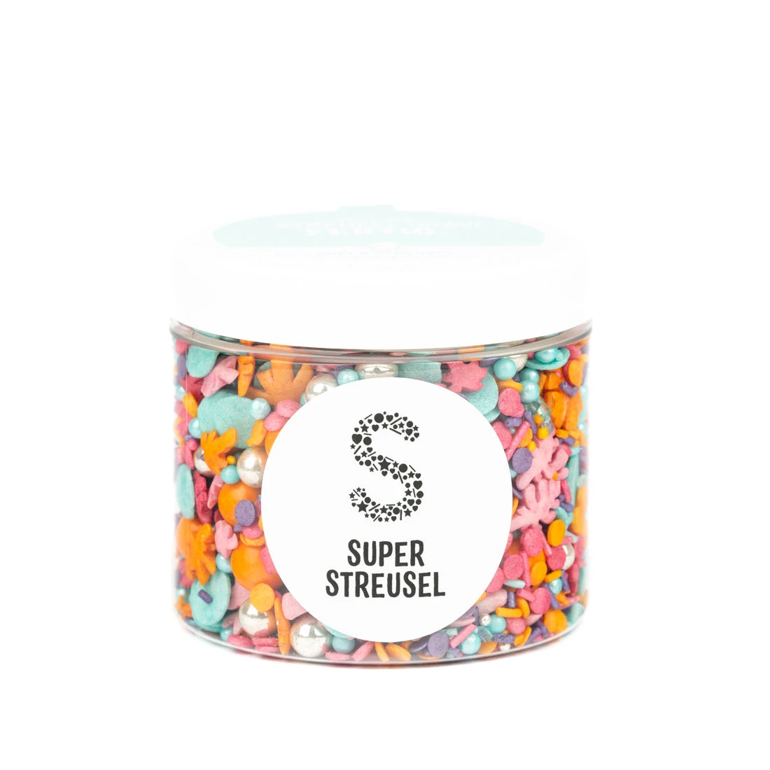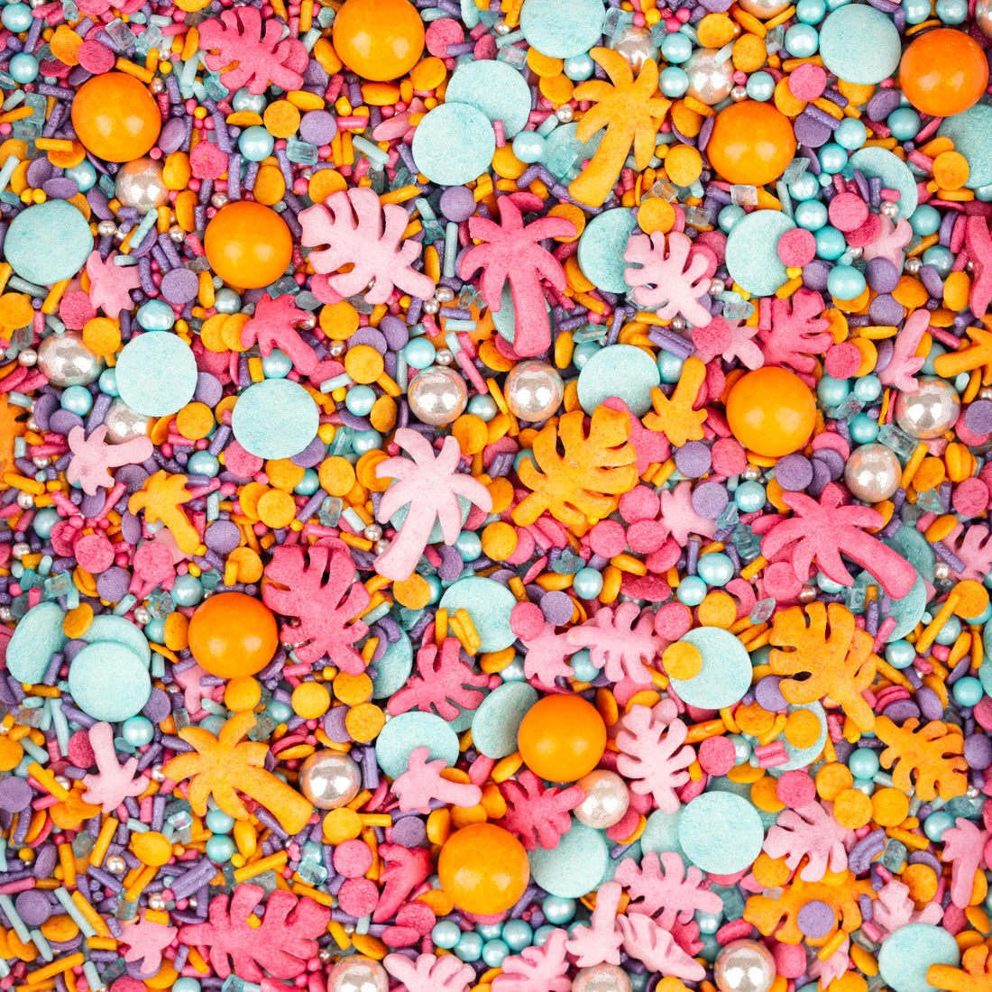 Extra für die Cake&Bake Messe 2023 haben wir mit euch zusammen den CommunityMix Urlaubsreif entwickelt. Ihr habt entschieden, welche Farben, welche Streusel, welche Motive – und der Mix ist streuseltastisch wunderschön geworden. Ihr habt es einfach drauf! Und das ist drin: Monsterablätter und Palmen in Flieder, Orange und Beere, orangene und silberne Schokokugeln, dazu riesen Konfettistreusel in Türkis sowie Kügelchen- und Konfettistreusel in Orange, Lila, Türkis und Beere.